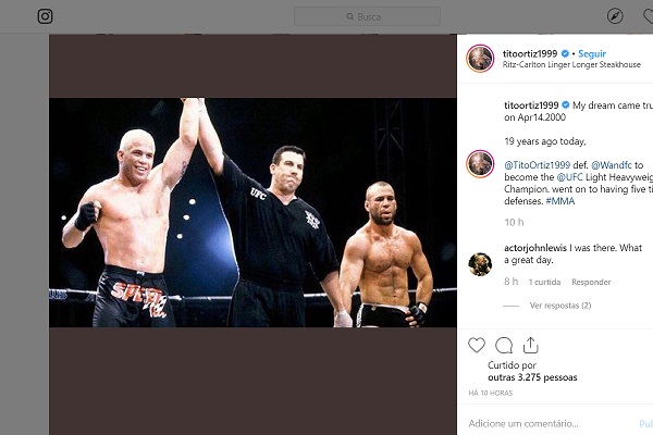 Por medio de publicación en Instagram (ver abajo o haga clic aquí), el veterano celebró el hecho. «Mi sueño se hizo realidad el 14 de abril de 2000. 19 años hoy, derrote a Wanderlei Silva para convertirme en campeón semi-pesado de la UFC, luego tuve cinco defensas exitosas de título», escribió Ortiz.