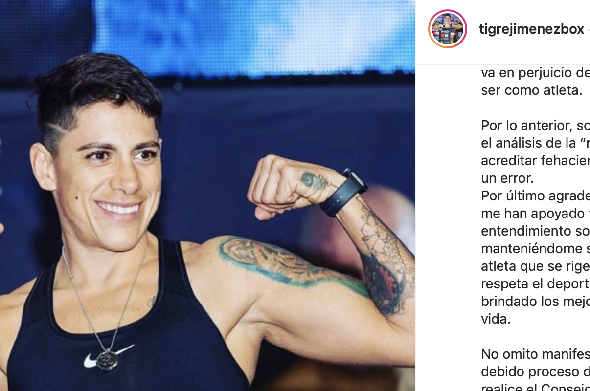 Por desgracia y, luego de hacer historia como la primer boxeadora mexicana en obtener títulos en las dos categorías más pesadas del boxeo (supermedio y completo), Alejandra ‘Tigre’ Jiménez no pasó una prueba antidopaje previo a su combate ante la estadounidense Franchon Crews-Dezurn: “La Agencia Voluntaria Antidopaje, notificó al WBC que encontró un resultado adverso en una prueba realizada el 11 de enero a Alejandra Jiménez como parte del protocolo antidopaje de cara a su pelea ante Franchon Crews-Dezurn. WBC ha iniciado el procedimiento correspondiente bajo los lineamientos del Clean Boxing Program», notificó Mauricio Sulaimán, Presidente del Consejo Mundial de Boxeo.