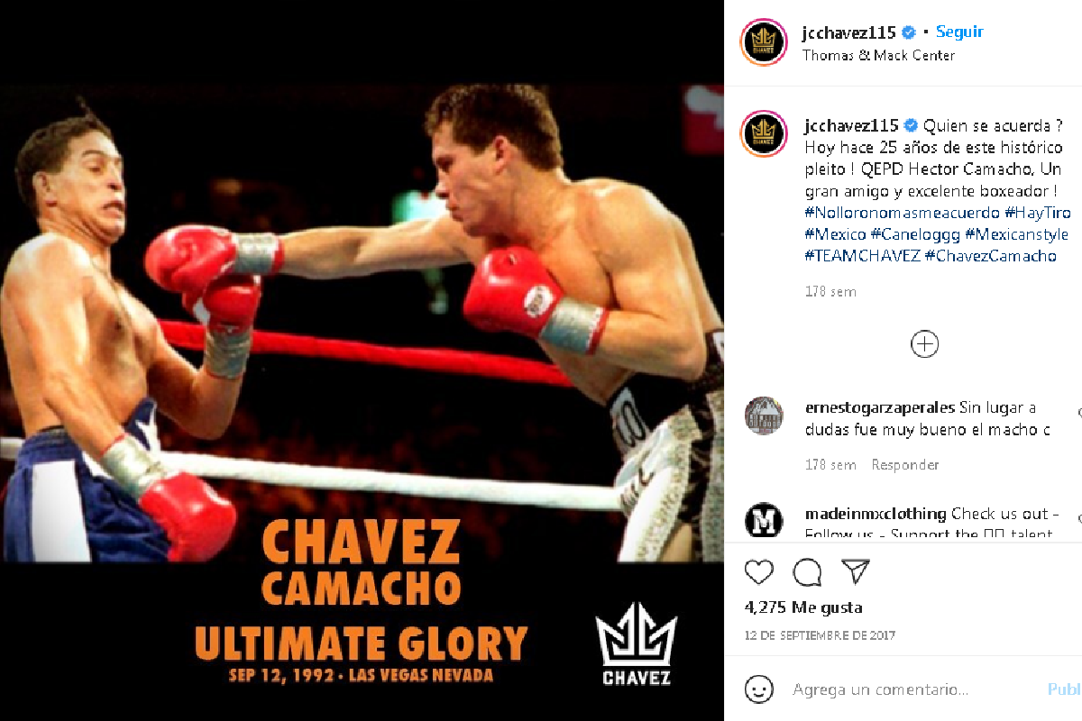 El próximo (19) de junio, Julio César Chávez volverá al ring en un duelo de exhibición contra Héctor ‘Machito’ Camacho Jr. en el Estadio Jalisco (México), pelea que rendirá homenaje al fallecido Héctor ‘Macho’ Camacho, con quien el mexicano tuvo una gran rivalidad. Además la cartelera contará con la presencia con dos hijos de la leyenda azteca.
