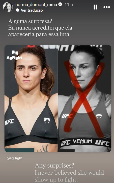 Norma Dumont no tardó en reaccionar a la noticia. En sus historias de Instagram, la atleta del gimnasio ‘Chute Boxe Diego Lima’ negó estar sorprendida por la retirada de su rival. Cabe recordar que incluso antes de que ambas se programaran para el combate de Noche UFC, la nativa de Minas Gerais ya había acusado a la excampeona de evitar una pelea contra ella dentro del octágono.