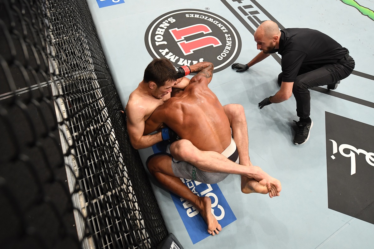 Faltando 10 segundos para finalizar el primer asalto, el australiano contraatacó llevando al ruso a la jaula y con una serie de ganchos y uppercut mandó a su rival a la lona por lo que el referi no dio tiempo para más y detuvo el combate.