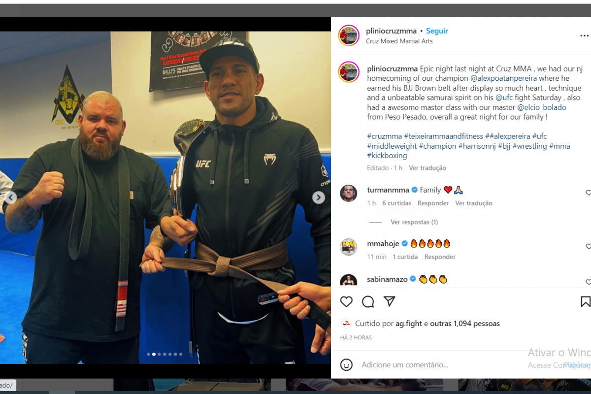 “Noche épica ayer en Cruz MMA, tuvimos el recibimiento a nuestro campeón Alex ‘Poatan’, donde obtuvo su cinturón café en jiu-jitsu luego de demostrar mucho corazón, técnica y un espíritu samurái insuperable en su pelea de la UFC el sábado”, escribió el entrenador desde Poatán.
