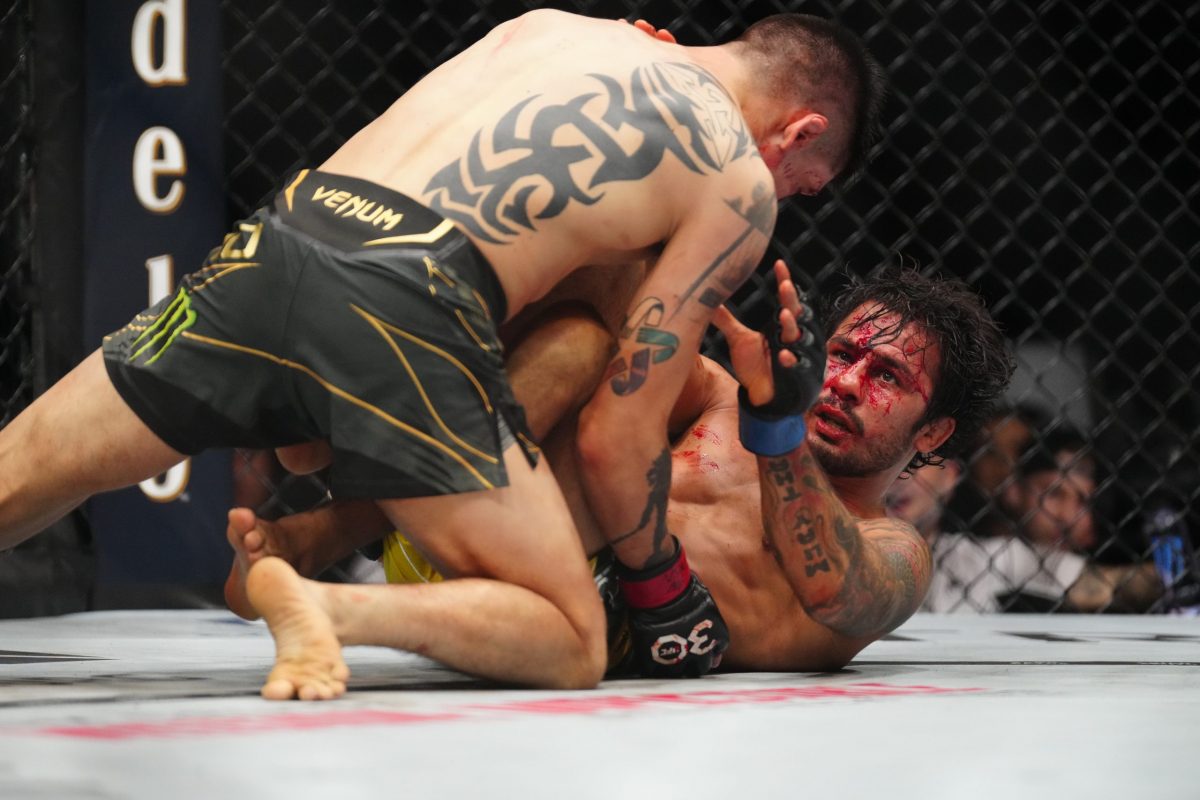 Pantoja tomó la delantera temprano en el quinto asalto con algunos codos bajos sobre Moreno, luego lo tomó por la espalda para un estrangulamiento, pero el mexicano se inclinó a la jaula para evadir la presión mientras que el brasileño siguió atacándolo con codazos.