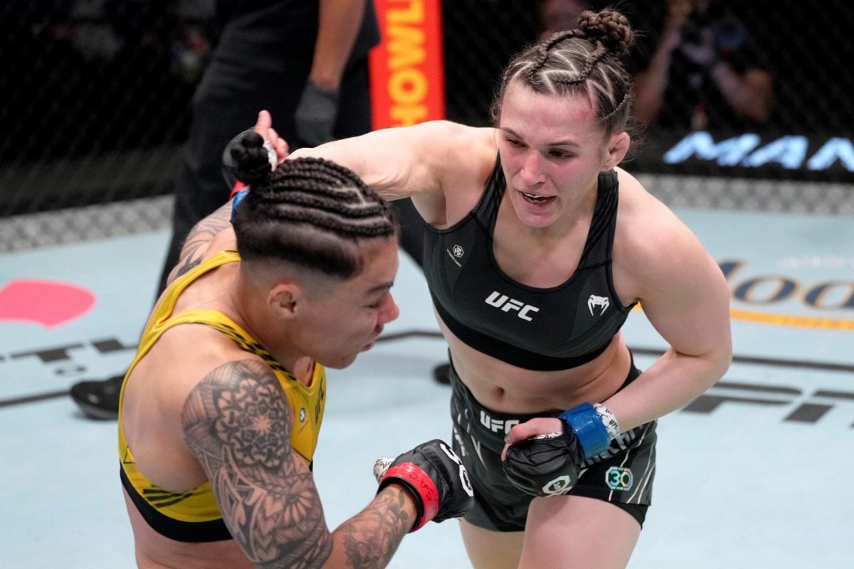 El duelo comenzó en alta tensión, con un franco intercambio de golpes por parte de ambas partes. Blanchfield, especialista en jiu-jitsu, intentó derribar a ‘Bate-Estaca’ dos veces, pero vio que la brasileña defendía bien sus ataques. Posteriormente, los pesos mosca alternaron buenos momentos en el golpeo hasta el final del primer round.