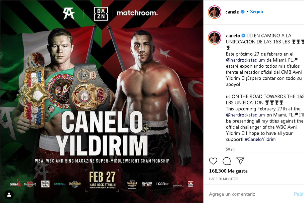 El mexicano Saúl ‘Canelo’ Álvarez volverá al ring el próximo 27 de febrero para hacer la defensa del campeonato Supermediano del Consejo Mundial de Boxeo (CMB) contra el retador obligatorio el turco Avni Yildirim, en el Hard Rock Stadium de Miami, Florida (EE.UU.)