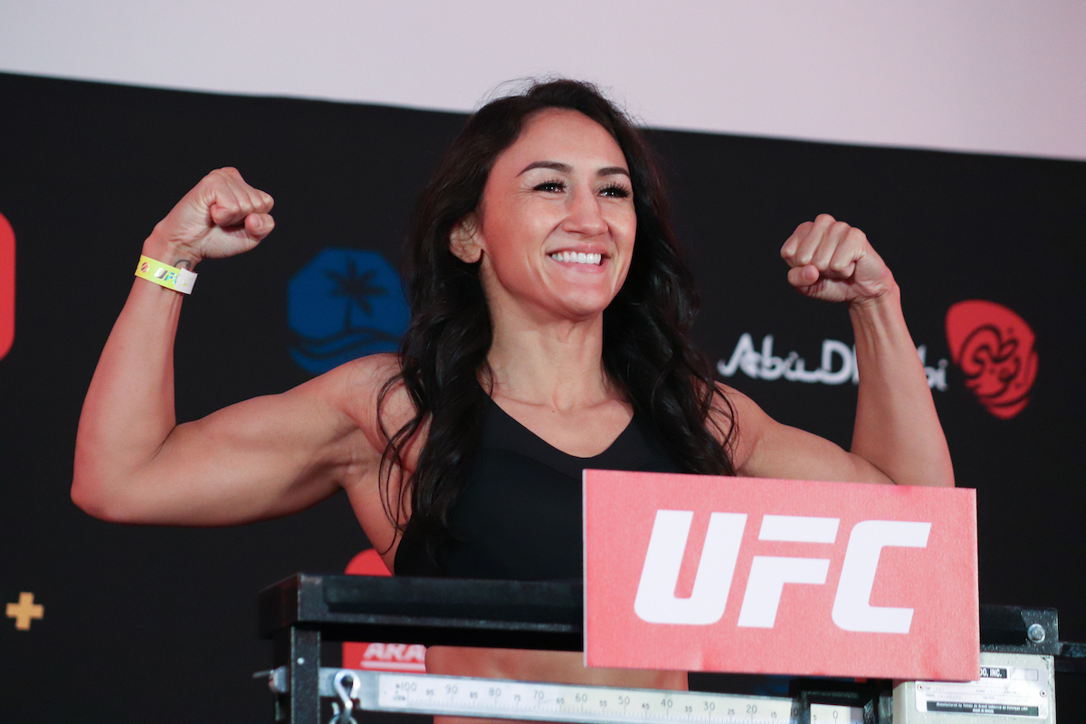 ABU DHABI, UAE - JULY 24: Carla Esparza poses on the scale during the UFC Fight Island 3 weigh-ins at Flash Forum Arena on July 24, 2020 in Yas Island, Abu Dhabi, United Arab Emirates.(Photo by Natassia del Frate/PxImages)