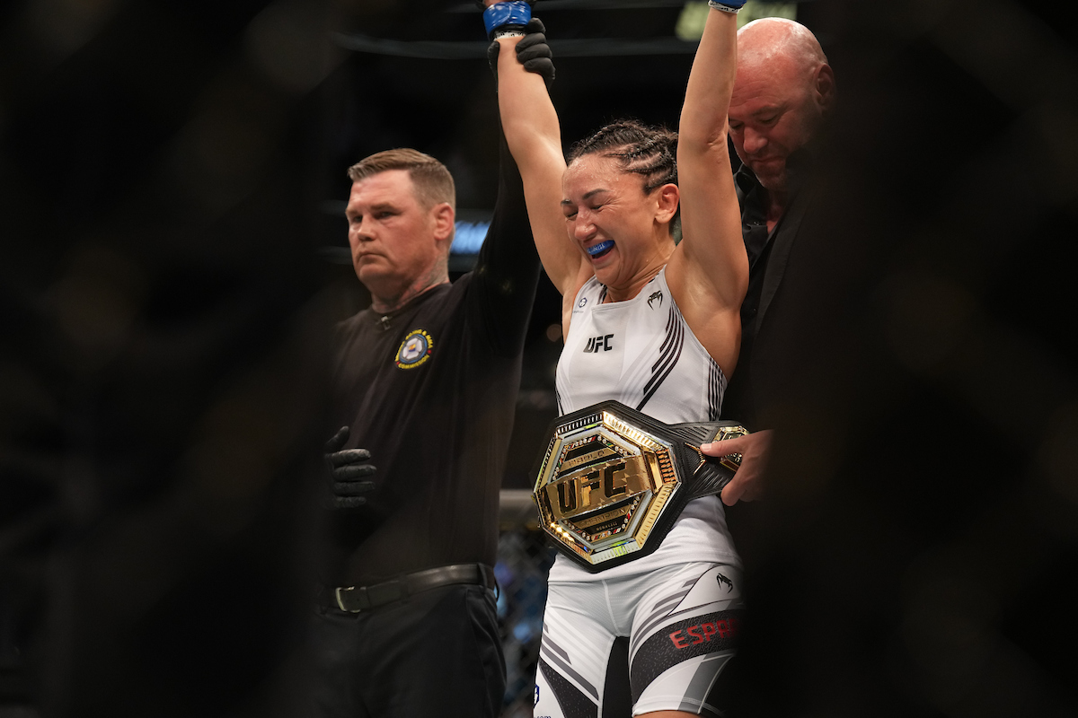 PHOENIX, AZ - May 7: Rose Namajunas and Carla Esparza meet in the octagon for a 5-round women’s strawweight title bout at Footprint Center for UFC 274 - Oliveira vs Gaethje : Event on May 7, 2022 in Phoenix, Arizona, United States. (Photo by Louis Grasse/PxImages)