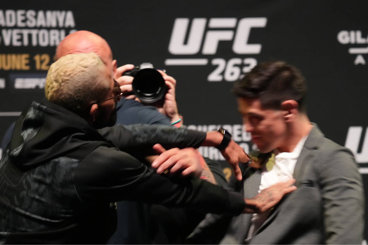 Durante la conferencia de prensa de UFC 263, realizada el jueves pasado, Deiveson reveló que estaba molesto por las declaraciones de su rival y afirmó que la disputa se había vuelto personal en su entendimiento, prometiendo callar y noquear al mexicano en el primer asalto, para detenerlo de una vez por todas. El campeón aún perdió la compostura durante las tradicionales confrontaciones cara a cara, empujando al retador, para consternación del presidente de la organización, Dana White, quien rápidamente separó a los dos.