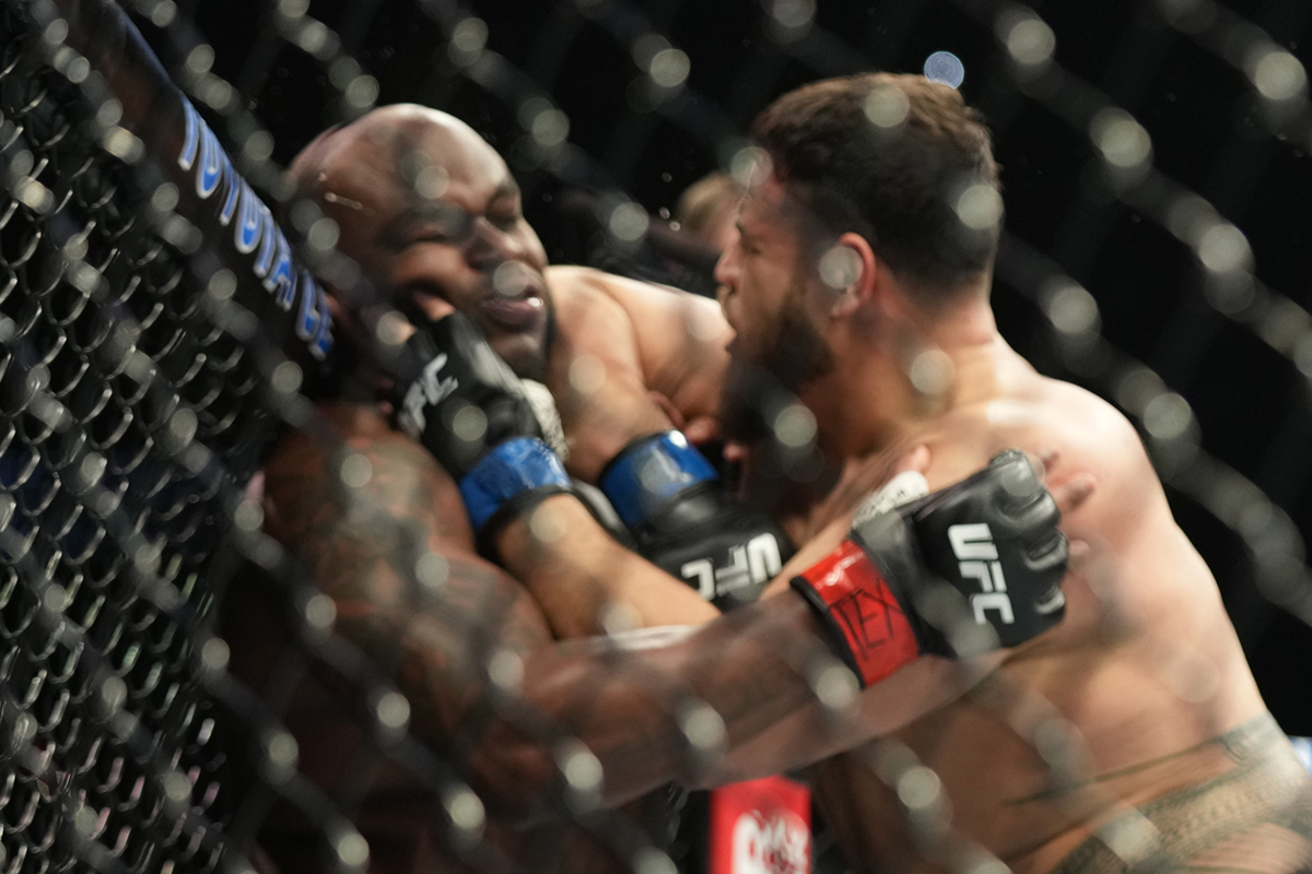 HOUSTON, TX - February 12: Derrick Lewis and Tai Tuivasa (L&R) meet in the octagon for the co-main event, a 3-round Heavyweight bout at Toyota Center for UFC 271: Adesanya vs. Whittaker 2 - Event on February 12, 2022 in Houston, Texas, United States. (Photo by Louis Grasse/PxImages)