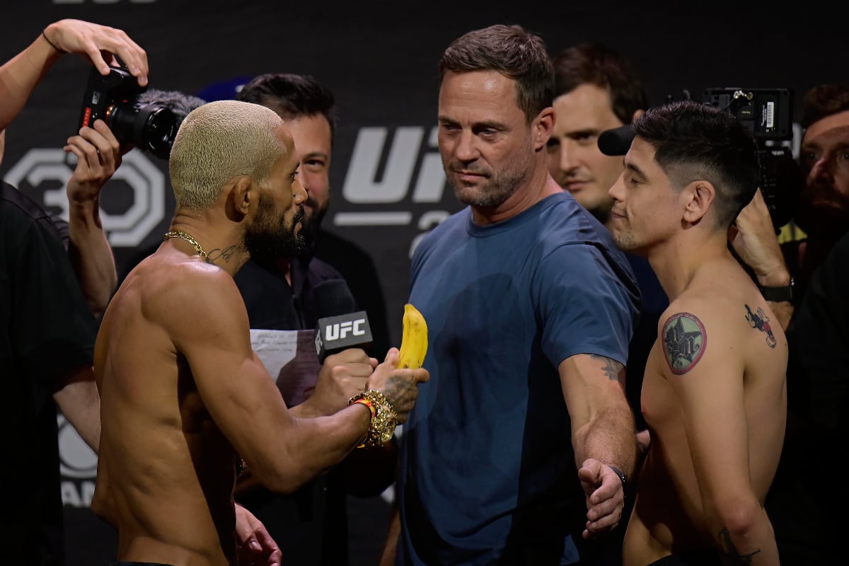 Uno de los capítulos más polémicos de la intensa rivalidad entre Deiveson Figueiredo y Brandon Moreno resurgió la tarde de este viernes (20), durante el pesaje ceremonial de UFC Río, realizado en el ‘Jeunesse Arena’. Tras ser objeto de ataques racistas por parte de un compañero del rival mexicano en junio de 2021, ‘God of War’ se comió una banana en el escenario frente al rival durante el cara a cara entre ambos.