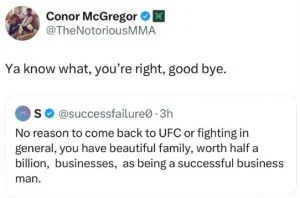 Luego de que un fan sugiriera que su riqueza y éxito hacían innecesaria la continuación de su carrera, McGregor respondió y estuvo de acuerdo con la afirmación, a través de su perfil oficial en ‘X’. La publicación, sin embargo, ya quedó eliminada, una práctica recurrente del luchador. Queda por ver si el excampeón de UFC, de hecho, cree que ya no debería pelear o si fue solo otra declaración de la que el irlandés se arrepiente y se retracta.