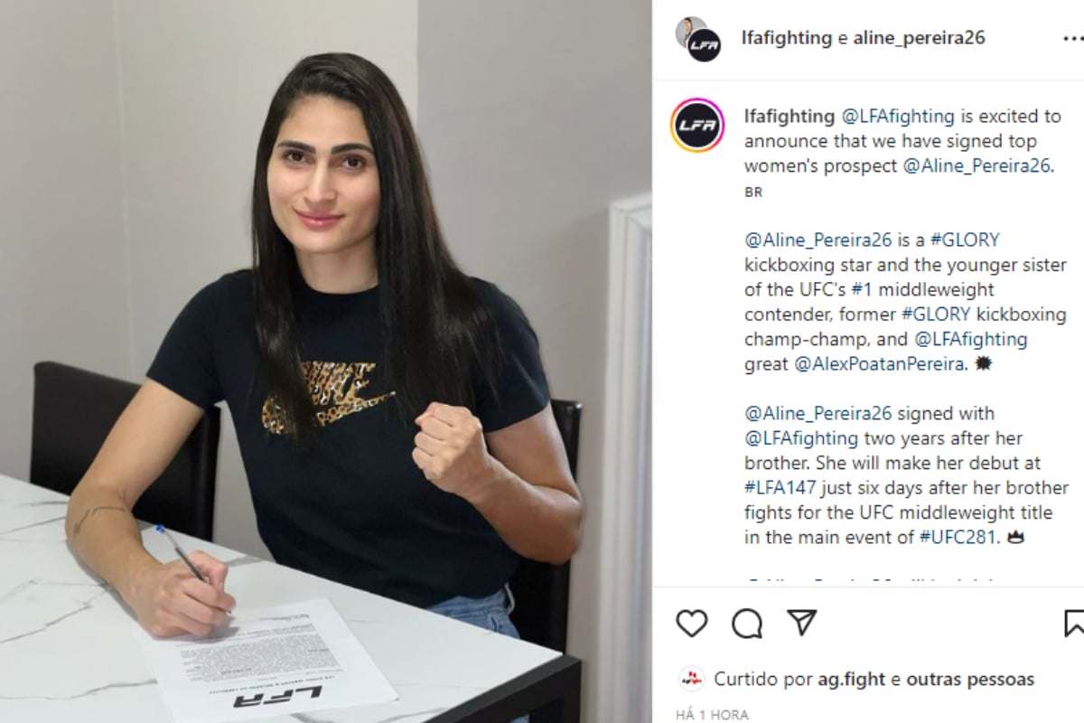 Siguiendo los pasos de su hermano mayor, quien migró definitivamente a las MMA tras convertirse en bicampeona de ‘Glory’, Aline Pereira fichó por el evento estadounidense ‘LFA’ y afrontará su primer reto en artes marciales mixtas el próximo 18 de noviembre para la cartelera de la edición 147, que se realizará en el estado norteamericano de Iowa (EE.UU.). En su debut, la brasileña enfrentará a la dominicana Helen Peralta, en duelo válido para el peso mosca (125 lb).
