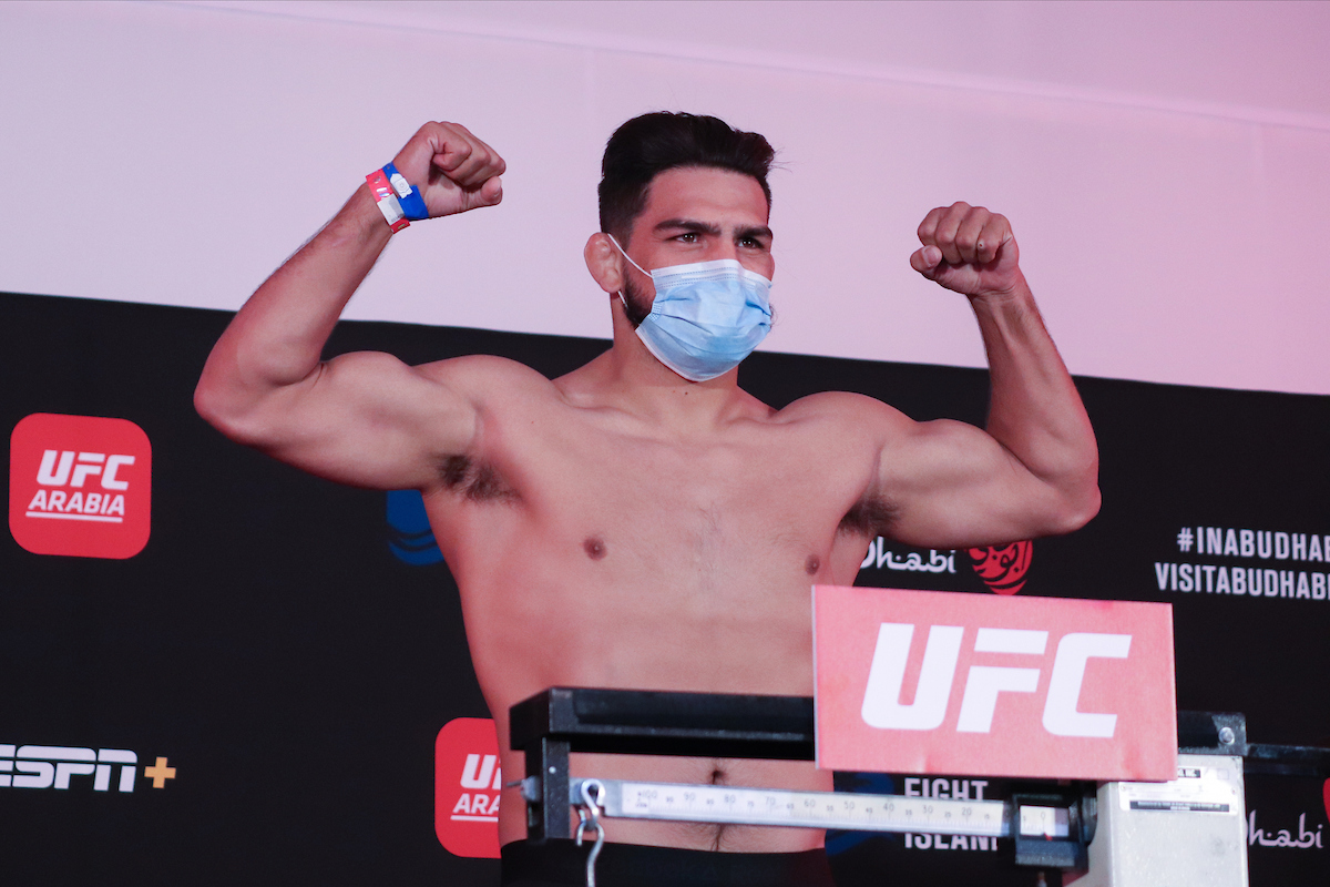 ABU DHABI, UAE - JULY 17: Kelvin Gastelum poses on the scale during the UFC Fight Night: Figueiredo v Benavidez 2 weigh-ins at Hotel W Abu Dhabi on July 16, 2020 in Yas Island, Abu Dhabi, United Arab Emirates.(Photo by Natassia del Frate/PxImages)