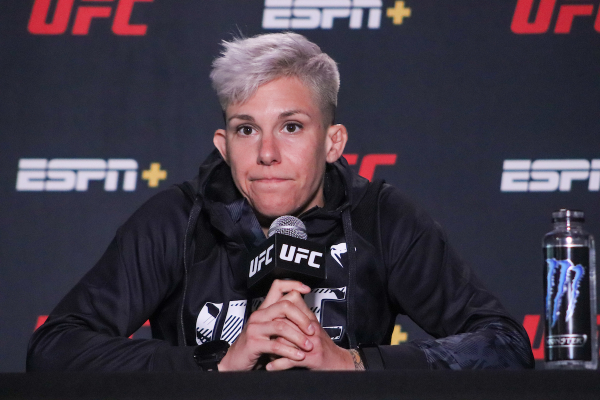 LAS VEGAS, NV - JULY 21: Macy Chiasson interacts with media during the UFC Vegas 32: Media Day at UFC Apex on July 21, 2021 in Las Vegas, Nevada, United States. (Photo by Diego Ribas/PxImages)