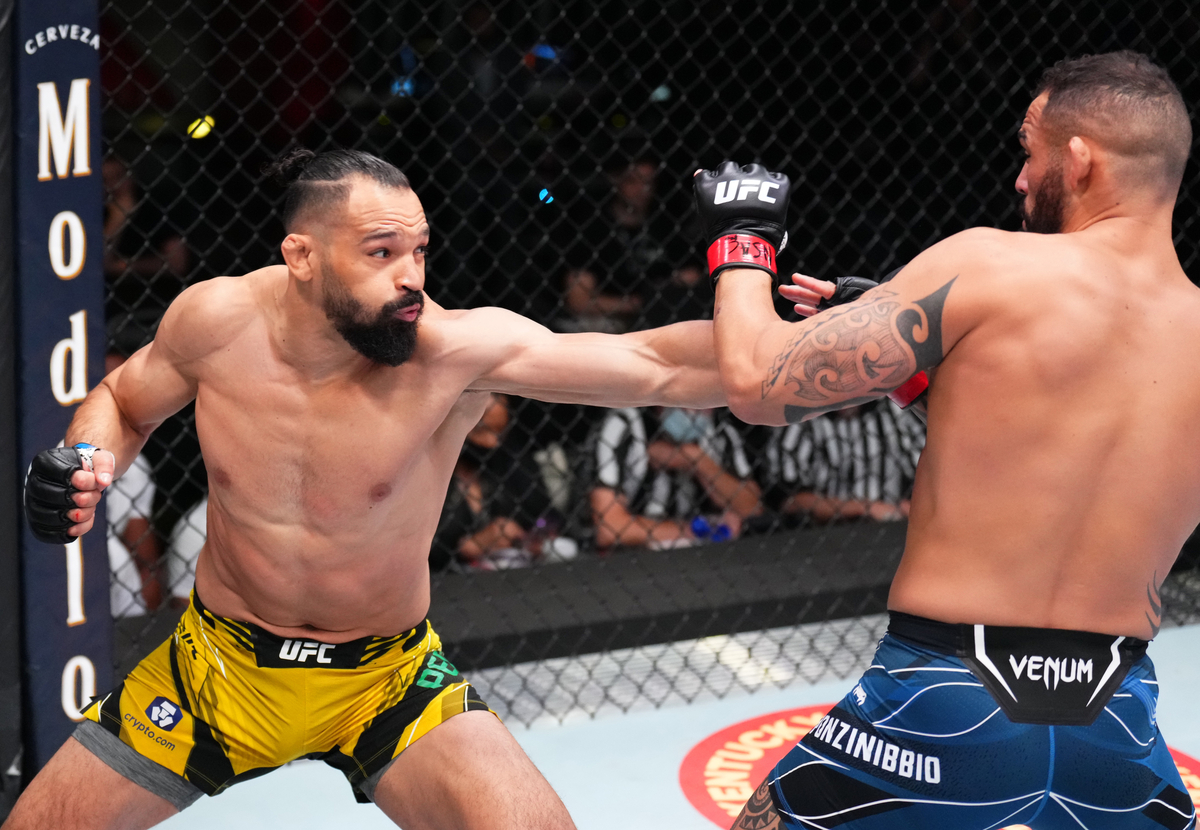 LAS VEGAS, NEVADA - MAY 21: (L-R) Michel Pereira of Brazil punches Santiago Ponzinibbio of Argentina in a welterweight bout during the UFC Fight Night event at UFC APEX on May 21, 2022 in Las Vegas, Nevada. (Photo by Chris Unger/Zuffa LLC)