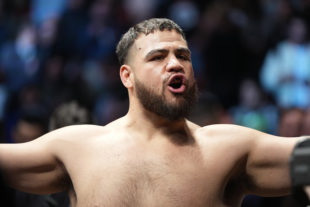 HOUSTON, TX - February 12: Derrick Lewis and Tai Tuivasa (L&R) meet in the octagon for the co-main event, a 3-round Heavyweight bout at Toyota Center for UFC 271: Adesanya vs. Whittaker 2 - Event on February 12, 2022 in Houston, Texas, United States. (Photo by Louis Grasse/PxImages)