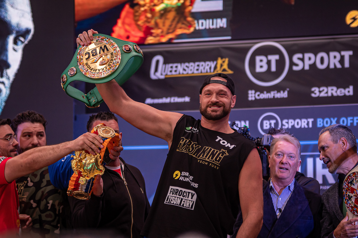 LONDON, ENGLAND - APRIL 22: Boxer Tyson Fury shows his WBC belt during the official weigh-in for his bout against Dillian Whyte at the Boxepark on April 22, 2022, in London, England, UK. (Photo by Matt Davies/PxImages)