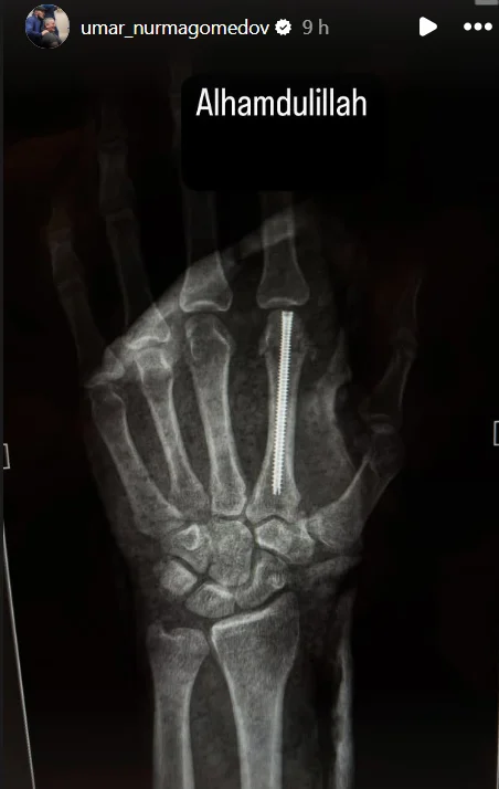 La lesión sufrida por Umar Nurmagomedov en su derrota ante Merab Dvalishvili en el evento coestelar de UFC 311, el pasado sábado (18), llevó al ruso a la mesa de operaciones. Este jueves (23), el peso gallo (61 kg) utilizó sus redes sociales para publicar una imagen radiográfica de su mano izquierda después de someterse a la operación.
